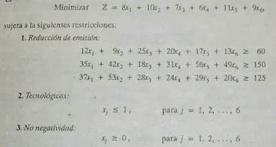 Los tres tipos principales de contaminantes son particulas de materia, óxidos de azufre e hidrocarburos. Los nuevos estándares requieren que la compañia reduzca su emisión anual de estos contaminantes en las cantidades que se presentan en la tabla del siguiente post. El consejo directivo ha dado instrucciones a la gerencia para que el personal de ingeniería determine como lograr estas reducciones en la forma más económica.